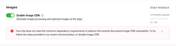 - Remediation Option 2: Disable Image CDN for your site(s). Since this vulnerability only affects websites that have Image CDN enabled, disabling the feature will eliminate vulnerability. Please note that disabling Image CDN will trigger a full rebuild of your site. Once rebuilt and deployed your site will no longer be vulnerable to the flaw.