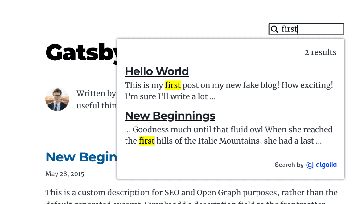 This guide will set up a search based on the Gatsby starter blog. You can base it on your own project instead, but that might require minor modifications to the code, depending on your page structure and the frameworks you use.