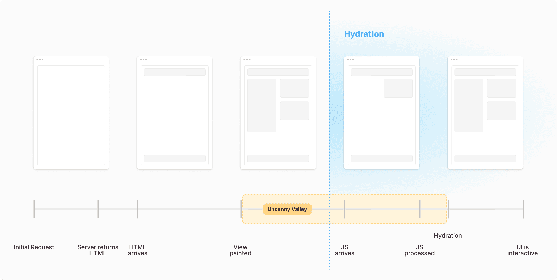 Although server rendering provides a faster First Contentful Paint, it doesn’t always provide a faster Time To Interactive. The necessary JavaScript in order to be able to interact with our website hasn’t been loaded yet. Buttons may look interactive, but they aren’t interactive (yet). […] The time that the user sees non-interactive UI on the screen is also referred to as the uncanny valley: although users may think that they can interact with the website, there are no handlers attached to the components yet. This can be a frustrating experience for the user, as the UI may look like it’s frozen!