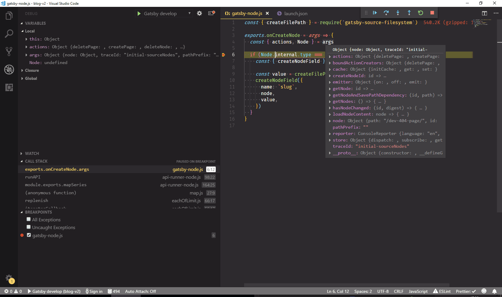 After putting a breakpoint in gatsby-node.js and using the Start debugging command from VS Code you can see the final result: