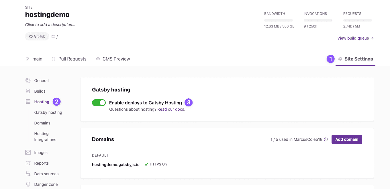In the Gatsby Cloud Site Hosting Settings, select “Enable Deploys to Gatsby Cloud Hosting”.