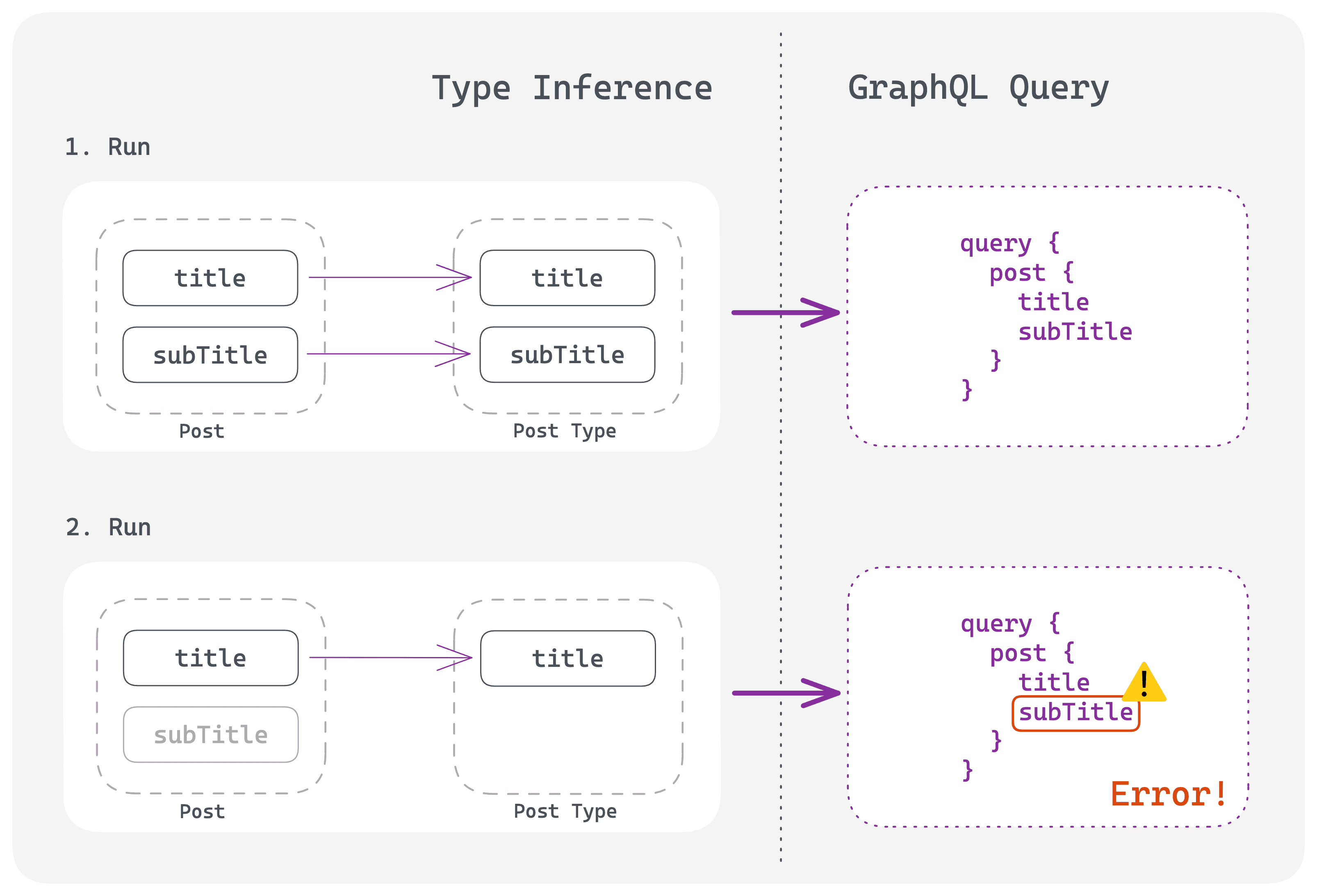 But on the second run the subTitle was removed from the data and as a consequence Gatsby didn’t infer this field. subTitle now doesn’t exist in the Post GraphQL type, but in the GraphQL query you’re still trying to query it. This leads to an error where Gatsby complains that it can’t find the field.