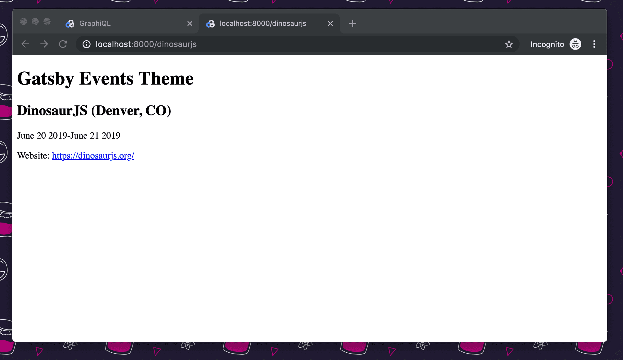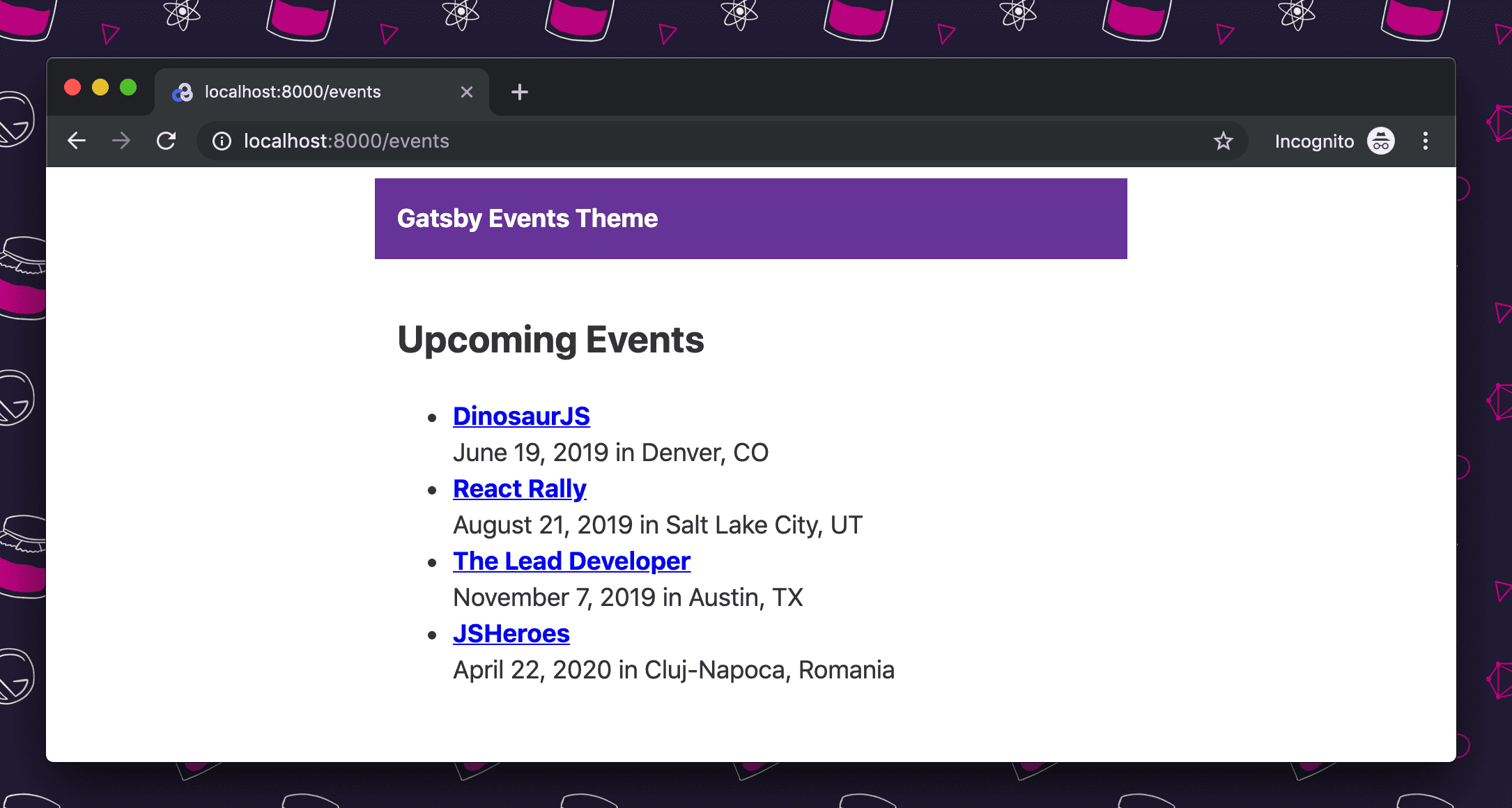 However, you don’t have any event data in the site. Copy the events.yml file from gatsby-theme-events/data into site/events. Then, restart the dev server:
